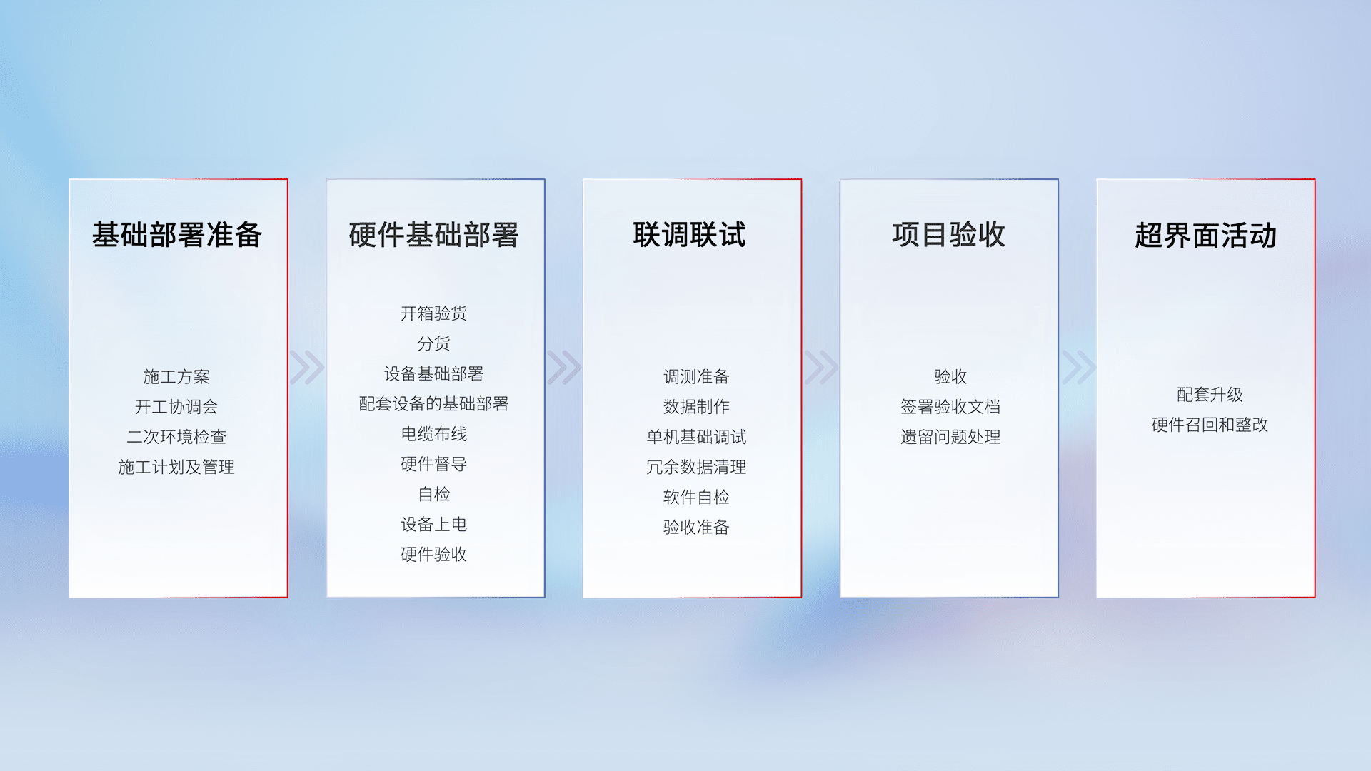 从基础部署准备、、硬件基础部署、、、联调联试、、、、项目验收、、越界面活动的全过程可追溯,,,保证施工质量和进度。。